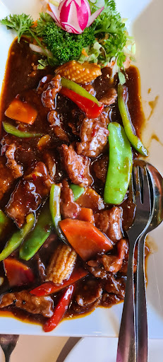 Ich hatte das knusprige Hähnchen mit süß-saurer Soße und Bami Goreng. Die Soße war über das komplette Hähnchen verteilt und machte dieses nicht mehr ganz so knusprig. Die Nudeln waren relativ fettig und mit einem anderen Fleisch gebraten, was ich etwas seltsam fand. An sich schmeckte das Essen okay. Mein Freund hatte die Pekingente mit weißem Reis. Der Reis war guter Standard. Die Ente war geschmacklich gut, doch war sie stellenweise trocken, da sie zu lange frittiert?! wurde. Leider gab es auch kein passendes chinesisches Gemüse dazu, so dass es nur die Ente mit dem Reis und ein bisschen Soße zum hohen Preis (~16€) gab. Die Garnierung bestand aus Gurken, welche bereits sehr bitter schmeckten, Radieschen, Petersilie und Möhren, die kunstvoll zu einer Blume geschnitten wurde. Letzteres würde allerdings schon vor längerer Zeit vorbereitet, da die Ränder...
