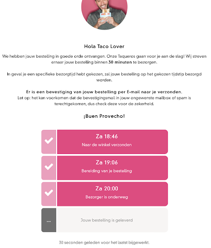 Read moreVery bad experience, not due to the helpless deliverer but the management at Voorburg branch. I don't blame the messenger. The attached screenshot tells a lot. We finally received our order at ±20:27, a few minutes after I sent them an email enquiry. As a result of the long delay, the taco shell became very soggy and difficult to retrieve from the carton box because they...