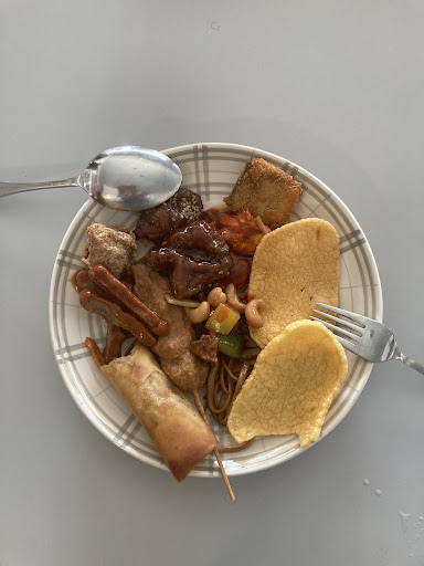 Op het menu stond de vega babi pangang met bami, de Vega saté, de loempia en de pisang goreng.