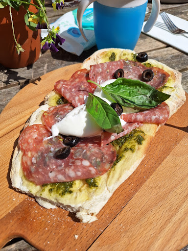 De pinsa was goed vers (met pesto, spianata romana en burrata). Goed in balans. Tip voor de eigenaar: check de spelling even van "spianata romana" op de kaart.