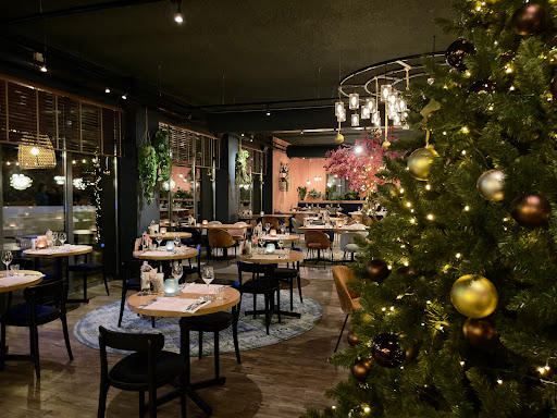 De inrichting van Humphrey's ademt een serene rust uit, mede dankzij het gebruik van natuurlijke materialen zoals koperen hanglampen, houten lambrisering en planten. Vooral in deze tijd van het jaar voegt de overdadige en prachtige kerstversiering een extra dimensie toe aan de ambiance. De combinatie van rood-roze tinten draagt bij aan een warme sfeer die uitnodigt tot ontspannen dineren.