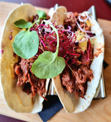 Voor het diner vrijdagavond hadden we niet van te voren bij het reserveren aangegeven vegetarisch te willen eten, waardoor de chef moest schakelen om een vegetarisch verrassingsmenu te kunnen bereiden. Hij ging even kijken, gaf toen groen licht en is aan de slag gegaan. Wat heeft hij dat uitzonderlijk goed gedaan! Ik kan best kritisch zijn als het op eten aankomt, al zal ik het netjes opeten als het tegenvalt, maar laat dan liever geen review achter. Ik zal dan ook niet bij alles de vlag uithangen, maar dit was fantastisch. We zijn een beetje omver geblazen door het voorgerecht (bitterballen van oesterzam, gefrituurde bloemkool in een jasje en een lekker romig courgettesoepje) en met name door de smaakcombinaties, de kwaliteit van de producten en de overduidelijke aandacht waarmee het was bereid. Het hoofdgerecht was wat veel bij elkaar, maar opnieuw heerlijk: gnocchi, veganistische rendang en zelf ontwikkeld 'pulled pork' (met echt pittige verse sambal), maar dan vega, dat de smaak en structuur had om van te gillen (positief), want stevig, mals en hartig. (Ik ben vergeten wat het was. Paddenstoel, tofu, jackfruit? Het was in ieder geval top van smaak.) Tegen de tijd dat het toetje kwam waren we zo verzadigd dat de goddelijke brownie met roomijs à la Oreo er bijna niet meer bij kon - een frisser toetje was dus ook lekker geweest - maar zo lekker was dat ook daar het bordje leeg ging.