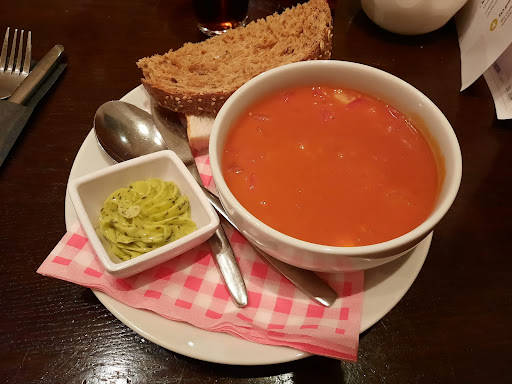 De tomaten en uien soep waren lekker. Als hoofdgerecht hadden we biefstuk met champignonsaus, geserveerd met meer dan voldoende salade en friet. Het dessert was een cheesecake met karamelsaus. Ook erg lekker, helaas zaten we na het heerlijke eten te vol om het helemaal op te krijgen.