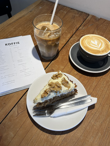 Read moreKOFFIE is a great place to sit down for a drink with friends or to grab a coffee to go. The coffee is strong, yet has a lovely earthy taste that’s best enjoyed with regular or plant-based milk. It’s also excellent as an iced option on a hot summer day. We also tried the carrot cake, which was exceptional — moist and flavourful, with warm cinnamon notes. The citrusy buttercream on top is creamy and rich in flavour, and it pairs well with the chopped walnuts, which add a nice crunch and texture. The staff are extremely friendly, and the atmosphere inside the café is pleasant. They even have dedicated laptop spaces with plugs for studying or work. It may get a bit noisy at times, but most people there don’t...