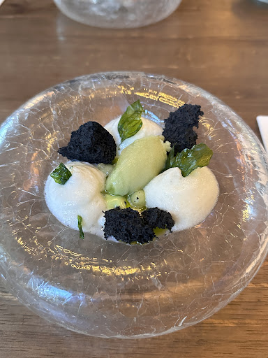 The desert (egg surprise) was stunning in its presentation, consisting of dry ice smoking up an egg with macha ice and mango ice over an 'egg' made of white and milk chocolate with a mango 'yolk' in its midst. Unfortunately the mango ice extraction of the desert was so sweet that it did not leave room for the more balanced flavors of the chocolate and macha.