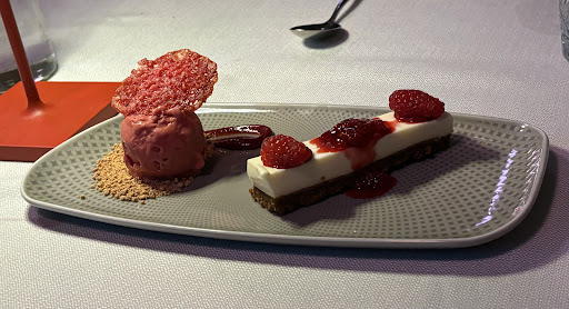 First off, let me state that the location was absolutely gorgeous. The restaurant (and hotel) is set inside an old church, so the atmosphere is so uniquely different than most fine dining restaurants. The restaurant itself is kind of on a platform, so you are closer to the ceiling of the church so you can better spot the old fresco's on there. The food was delicious, I had a 3-course meal and was full by the end of it. They gave us plenty of bread to snack on between the courses, and the portion sizes were perfect. My favourite dish was the cheesecake with raspberry sorbet, absolutely loved it. If you are looking for a unique fine dining experience in Maastricht, I could not recommend this place more, it was so much fun to dine in...