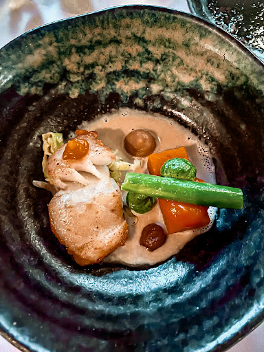 We aten het (vaste) chef's menu van 5 gangen. Het gebeurt me zelden maar ik had nog trek aan het einde van de avond. De porties waren gewoon te klein. De gepekelde kabeljauw was de topper van de avond, zo bleek later. Ik zou het vega gerecht van de kaart halen; een gerookte wortel door midden gesneden op smaak gebracht met tierelantijn; niet heel bijzonder. De geroosterde Noordzee schol viel tegen; het geheel miste structuur en stevigheid. Het moerkalf bestond uit twee mini bloemkoolstukjes, en twee kleine stukjes kalfsvlees, met een paar druppels kalfsjus. Te kleine portie en de jus werd niet bijgeschonken ondanks ons verzoek (de jus mocht niet op tafel blijven zodat we zelf konden bijschenken).