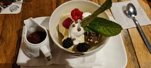 Kees houdt niet van 'lastige' klanten..!! (Hij laat je dan gewoon wat langer wachten, is zijn strategie) Glutenvrij is daardoor helemaal problematisch, voor het hele bedieningsteam (hij lijkt de teamleider te zijn). Het (gluten bevattende) sausje bij mijn (verder lekkere) eend werd gewoon weggelaten..ipv een alternatief te bieden. Dat bedacht ik dan maar zelf (chocoladesaus, kan ook bij eend🤗 (bosbessen waren er niet, die leken mij lekkerder erbij) Krijg ik er even later een zoet warm ijssausje bij geserveerd. Kan echt niet, dat is veel te zoet, zonder zout/bouillon oid is dat geen combi met vlees. Gelukkig zag een wèl-vriendelijke collega wat er gaande was en hij bood ons een gratis dessert aan. Heel fijn, gastvrijheid gered🙂. Maarrrrrrr dat dessert, dat ging Kees dan weer bepalen, ik mocht dat niet van de kaart uitkiezen. Een sorbet werd het. Op zich een goed idee, iig geen gedoe met allergenen enzo. Maar dan wel weer een lullig klein bakje ijs voorschotelen, niet vergelijkbaar met de desserts die ik bij anderen zag, qua hoeveelheid. En...nu waren er opeens wel bosbessen! Heel mooie plek, de kwaliteit van het eten is ook goed. De rest laat zich raden...tenzij ze een ander aan het hoofd vd bediening neerzetten. Dan hebben zijn collega's en de klanten ook geen last meer van zijn...
