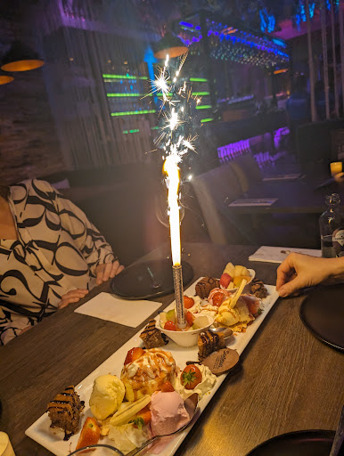 We kwamen binnen met ca. 10 man, ze gaven aan dat bestellen a la carte kan, maar dat het leuker is als ze zelf vanalles neerzetten.. Nou wij vonden dat wel leuk en lieten ons verrassen! Voordat het eten kwam waren we 0.45 min verder, maar er kwam zo weinig dat telkens de bordjes meteen leeg waren. Ook op de " vis schotel" lagen er voor 10 man maar 5 garnalen op.... Ja.. die worden weggekeken natuurlijk! We hadden een aantal keer gevraagd of er meer eten kon worden gebracht omdat we gewoon nog honger hadden. Ook 2 kleine ronde schaaltjes friet en salade was niet voldoende. Toen we er vaker om vroegen reageerde de eigenaar erg bot, en deed of wij erg grote eters waren en dit niet normaal was...alhoewel dit niet is ( geen prettig gevoel om te krijgen). Het toetje lieten we dus maar zitten..