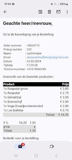 Read moreAf en toe blijven proberen omdat het makkelijk (dichtbij) is. Nu helaas toch maar een review, dacht na 10 min wachten na de besteltijd laat ik hier iets over schrijven. Wanneer mijn beoordeling ingetypt was voor mijn bestelling klaar is dan gaat hij online en als zij eerder klaar zijn slikken we het. Maar helaas elke keer als je eten besteld tot nog toe 5 van de 5 keer minimaal 10 min later klaar tot zelfs 20 minuten. Altijd kleine bestellingen (voor 2 personen) wat mij niet heel ingewikkeld lijkt voor een cafetaria waarbij het meeste binnen 10 klaar is.
