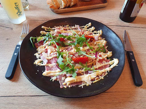 Read moreWe kwamen zonder reserveren om 19 uur. Ja er was nog plek na gevraagd te hebben voor ons 4. Buiten konden we een tafel kiezen. Lekker in de zon, heerlijk. Drankje erbij en de kaart. Helaas na 45 min wachten konden we pas de bestelling doorgeven. Ook al eens een meisje aangesproken, nee mijn collega neemt de bestelling op. Na weer 45 min wachten kwam ons voorgerecht er eindelijk aan, maar op eten kon helaas niet want we hadden geen bestek. Hier moesten we toch echt 2 minuten op wachten. Mosterdsoep, lekker maar veel te scherp en spekjes waren er uit gewaaid denk ik. Een ander voorgerecht was dus flink afgekoeld maar ja. Omdat de zon lekker scheen wachten we rustig af op het hoofdgerecht. Plots horen we naast ons de bediende die op een walkie talkie hard sprak tegen de keuken dat onze tafel door kon met het volgende gerecht. Niks niet heeft het gesmaakt? Toen weer lang wachten kwam het hoofdgerecht. Snitzel had een natte vissmaak en drupte van het vet, varkenshaas was droog, spareribs wel lekker maar erg scherp en de zalm werd geserveerd onder zalm met ham maar dat was niet de benaming dus beetje onhandig en onvriendelijk. U wilde nog een biertje zegt een serveerster plots terwijl we aan het eten waren, nee zeggen wij en ze loopt zo weg, niks geen eet smakkelijk. Salade bar was binnen, Nou sorry compleet leeg dus. Uiteindelijk naar de wc.... is er maar 1. Dan maar betalen... sorry er is maar 1 collega die dat kan en iedereen rent maar heen en weer. Eindelijk na 8 min kan de persoon voor me betalen en als ik aan de beurt ben, loopt die dame weg. Als ze terug komt lacht ze wat, ja ik kan nog steeds niks tegelijk en terwijl ze mij wil laten betalen delegeert ze collega's. Jammer dit komt niet goed over zo. Niks geen vraag heeft het gesmaakt of iets nee direct bedrag noemen en niet eens even doorlopen of dit klopt. Redelijk oke gegeten maar we raden het niet aan. Heel jammer, maar sorry voor het lange wachten of even vragen of het gesmaakt heeft, wat ze juist delegeerde aan een collega voor een andere tafel was wel op zijn plaats geweest. Jammer Jammer Jammer, het kan er...
