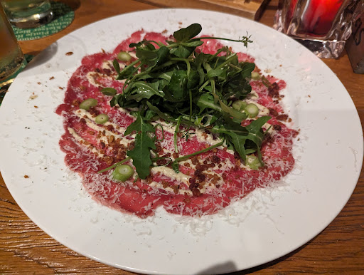 The food was really good although I do have 1 complaint about the Carpaccio: Don't add bacon bits as a substitute to pine nuts, it makes the flavour too salty and takes it away from what it's all about, the beef carpaccio. Do have to say the chicken Sate was really good and honestly a huge portion! Good...