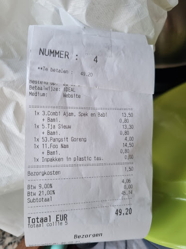 Read moreverhuisd in de regio en voor het eerst hier besteld. Ik had foo nam en tsa siew besteld en een combi babi pangang. Ik kreeg 3 bakken. 2 foo nam ( of babi pangang spek) en 1 babi pangang mager. ik kreeg 3 sausjes 1 is voor de pang sit. Daarnaast miste dus de tsa sieuw en de de 2 bakken spek en de magere waren zo droog als de sahara. Zie fotos van bestelling en geleverde. ( iemand had erg honger dus de hoeveelheid is geen weerspiegeling, er is al iets uit) Jammer zal ik dus voortaan toch in de auto moeten stappen voor een chinees etentje