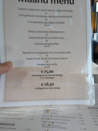 Heerlijk onder een grote parasol op het terras. Je moet dan wel met veel (vrachtverkeer) rekening houden, maar dat heeft ook wel wat. De ontvangst was heel vriendelijk en hetzelfde geldt voor de bediening. Het eten was uitstekend verzorgd en lekker en met dieet wensen wordt rekening gehouden. Je kunt met de lunch ook kiezen van de diner kaart. Ik koos een heerlijke maaltijdsalade met ossenhaas puntjes en mijn vrouw een heerlijke steak met knoflooksaus. Wat ik hier fijn vind is dat er altijd meerdere groentes bij geserveerd worden. En dat ontbreekt nog weleens bij andere restaurants in de omgeving. Dan ben je al 'blij' met een schaaltje sla. Hazelnootijs met pinda's en karamel is een aanrader als toetje. Straks in het najaar hebben ze weer wild stoofpotjes en daar kijk ik nu al naar uit. Kortom, ze zijn wellicht niet het goedkoopst, maar het is alleszins de...