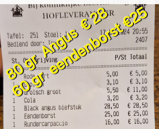 Lunch was matig. Goulash soep is te zoutig. Ik denk dat die uit het zakje/blikje komt, anders kan ik niet verklaren waarom er in godsnaam zo veel zout in zit. Wijn was onwijs zuur. De soep was 7 euro, wijn 4.75 per glas. voor twee mensen kom je op 23.50 euro uit. De rekening was 24.50 euro. Heee waar is 1 euro gebleven?