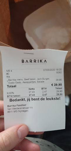 Read moreHet is 2020, het jaar van de coronacrisis. BARRIKA is creatief en heeft het goed aangepakt. Thuis lekker kunnen genieten van het geweldige eten van BARRIKA. Voor het eerst eten op van BARRIKA en het was echt super 😄! We vonden het beide erg lekker, zeker de beef was echt verrukkelijk! Ook de Jack Burger was heerlijk en een prima Gado Gado. Daarnaast een behoorlijke portie ook met de bijgerechten erbij. Voor slechts 14.95 p.p. krijg je dus een ontzettend goed menu met 3 hoofd- en 2 bijgerechten! Nog wat aardappeltjes en salade voor de lunch morgen ;-)!