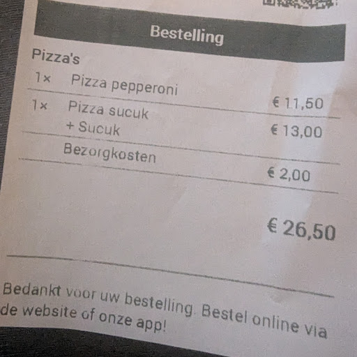 Read moreIk had een pizza sucuk met extra sucuk besteld van €11,50 waar ik €1,50 voor bij betaal. Geen probleem, als het ook daadwerkelijk op m'n pizza had gezeten. 8 dunne plakjes sucuk zaten erop. Toen ik belde zei de dame dat ze er wel extra op had gedaan. Dat zou dan betekenen dat je normaal 4 plakjes krijgt? Toen ik zei dat ik 4 plakjes voor 1,5 euro erg weinig vind werd mij gezegd dat alle extra's een euro kosten.