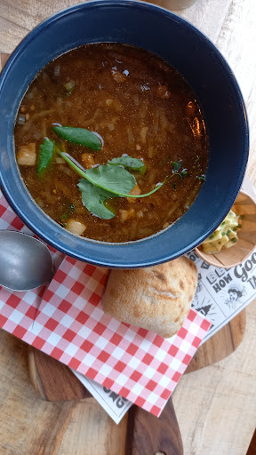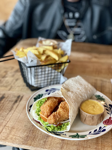 We ate outside with our dog whilst touring the Netherlands. The staff were very friendly and spoke excellent English. My husband had the pulled pork loaded frites and said they were delicious. I had a veggie croquet and frites, the veggie croquet was ok, frites lovely as was sate sauce. The black tea, which we did drink black, was so good we ordered another cup each, very unusual to have such lovely tea as a Brit abroad!! The cafe was spotless inside as well and obviously appreciated by the locals too. Nice place...