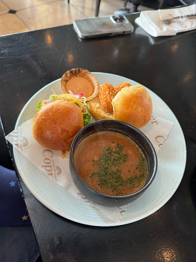 2 for 1 dus uit lunchen voor een redelijke prijs bij Copper. Van tevoren reserveren is noodzakelijk, want de tent zit ramvol op zaterdagmiddag. Hoe gezellig het er van buiten uit ziet, hoe kil is het van binnen. Veel marmer en strakke styling in veelal donkere kleuren is blijkbaar niet zo mijn ding. Maar zo te zien wel voor het veelel jonge publiek. Veel twintigers/dertigers en slechts hier en daar wat koppels die de gemiddelde leeftijd omhoog halen...zoals ik met mijn 50+ haha. De akoestiek is door al het marmer ook ver te zoeken, want het is nogal lawaaierig. Afijn, de bediening leid ons naar een prima tafeltje en er staan zeer vlot een paar drankjes op tafel. De bestelling wordt opgenomen, maar veel valt er niet te kiezen aangezien 2 for 1 een vast menuutje is. De serveerster verkoopt ons een portie friet erbij, wat een goede keuze blijkt. Vervolgens wordt er een shared platter op tafel gezet en deze is echt heel lekker. Pittig soepje erbij, kroketjes, toast met steak tartare, Gyoza. Echt heel goed allemaal. De serveerster komt regelmatig langs om te vragen of alles in orde is. Daar hou ik van, want dat heb ik veel liever dan dat ik steeds oogcontact moet zoeken. Kortom; voor het eten kom ik nog eens terug. Hopelijk hebben ze het tegen die tijd ook een beetje...