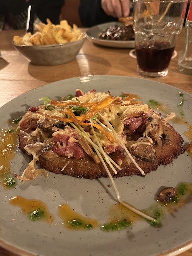 Read moreHeerlijk gegeten, wel vrij prijzig. Zeker omdat je al €20 voor alleen een schnitzel betaalt en je dan ook nog voor €2,75 patat erbij moet bestellen. Kwaliteit eten was echt meer dan prima. Onze nekharen zijn alleen écht overeind gaan staan van onze serveerster. Wij kwamen binnen met onze tweeling en werden vriendelijk ontvangen door een mevrouw. Daarna nam een serveerster het over, die al niet geheel vriendelijk reageerde toen ze vroeg of we gereserveerd hadden. We hadden onze tweeling bij ons met een tweeling wagen en blijkbaar stond dat de mevrouw niet zo aan. We hadden onze kindjes aan de kop van de tafel gezet, achterin het restaurant. We zouden dan niemand tot last zijn en onze baby’s zouden dan niet weg gepropt in een hoekje staan. Na 1 seconde kwam mevrouw de vriendelijke serveerster al met de volgende opmerking: ‘Ik wil niet heel vervelend zijn, maar zo kan ik niet uitserveren’. Uiteraard begrepen we wat ze bedoelde, maar de toon en de manier waarop ze deze mededeling deed, zorgde ervoor dat we eigenlijk al klaar waren met deze mevrouw. We gaven aan dat we de kindjes aan de kant zouden halen als dit nodig was en dat we het anders zelf zouden doorgeven als dit nodig was. Vervolgens kwam ons drinken en deed mevrouw overdreven moeilijk, alsof ze bijna geen ruimte had. Terwijl we al aangaven dat we het ook vanaf de andere kant van de tafel aan de desbetreffende persoon zouden willen doorgeven. Ik had het idee dat ze wel voelde dat we niet erg te spreken waren over haar manier van communiceren, want daarna was mevrouw ineens wel vriendelijk. Ik had meteen gegeten en gedronken, dus bij mij kon ze het niet meer goed maken met een lieve lach. We hebben heerlijk gegeten, dat is het positieve waar ik deze review mee...