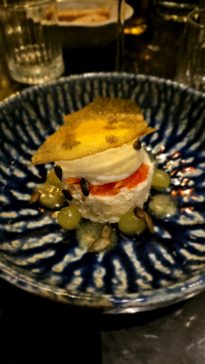 De maître presenteerde de eerste begeleider op enthousiaste wijze. Een Verdejo 2016 uit de Rueda van Telmo Rodriguez, aangenaam fris met mineraliteit. Op het bord een traag in de oven gegaarde octopus tentakel met geschroeide tomaten, toefjes tomaten crème, tomaten jus, anijs bloemen en crumble van zwarte olijf. De octopus was lekker zacht met prima textuur. Een zomers gerecht met hele pure smaken waarbij lekkere kruiden accenten door de anijsbloemen. (8,8)