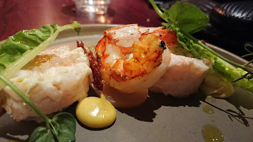 Verder met een Spaanse Tibó 2017 van De Moya, wat voller met een aangenaam zuurtje in de afdronk. Op een wit bord gegrilde tarbotfilet gekruid met zeste van kafir, stukje kreeftenstaart, quenelle nasi kuning en kleine marshmallows van kokos, overgoten met een schuimige kreeftensaus. Luxe smaken met Aziatische toetsen, genieten! (8,75)
