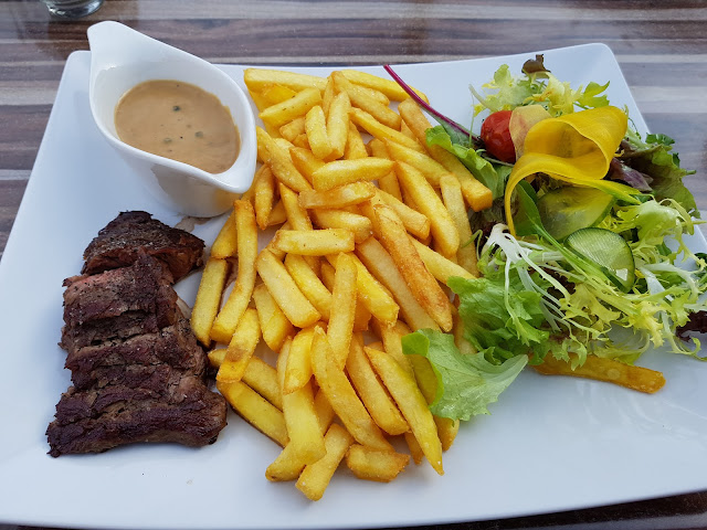 Gisteren op het terras gezeten, we kwamen in de middag. Ik bestelde een black angus beef, omdat ik moest werken en vooraf wilde eten. Het eten was er redelijk snel, wat mij echter tegenveel waren de porties (zie foto). Weinig biefstuk veel friet en sla, de prijs: 17,50€. Mayonaise krijg je er ook niet bij.