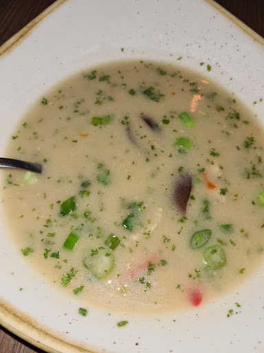 We kwamen voor een snelle hap en begonnen met de Thaise kippensoep. Deze was natuurlijk niet echt Thais, maar smaakte prima. Het was meer een pittige kippensoep met paddenstoelen, chillipeper en kokosmelk. Het brood dat erbij kwam was lekker warm en knapperig. Het hoofgerecht was een burger. Daarbij namen we een salade en deelden we een frietje (op aanraden van de bediening, want 1 portie friet is genoeg voor 2 - en dat was het zeker!). De burger was royaal, goed gebakken en smaakte goed! Frietjes en salade waren prima. Alles werd ook met een fijn tempo geserveerd. Een aanrader als je niet te veel...