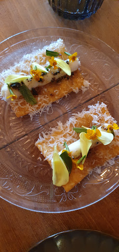 Ruim een week geleden geluncht met een klein gezelschap.Sfeer en inrichting subliem. Ontvangst redelijk streng door een bordje in de trant van "hier wachten totdat u een plaats krijgt toegewezen". Als lunch bestaan er eigenlijk alleen de keuze van een twee- of meergangen menu, waarvan de samenstelling verder geen enkele keuze biedt. Aan mijn vraag of de cevice van zeebaars kon worden vervangen door een paling gerechtje van de borrelkaart kon niet worden voldaan, alleen steak tartaar bleek mogelijk. Op de vraag of er nog een extra broodje kon worden geserveerd, was het antwoord "maar er staat nog wat op tafel" (drie plakjes!!; terwijl het voorgerecht nog moest komen) Stilzwijgend werd later alsnog een broodbolletje geserveerd ( €5,00 zonder verder garnituur) Los van de absurd minieme portionering was de smaak van de voorgerechten goed, afgezien van de bloementuin op het bord, die alleen naar bloemen smaakte. Aan het serveren van het hoofdgerecht ging een storende en ellenlange uitleg vooraf door de 18 (??) bestanddelen waaruit het bestond op te noemen en dat met een saus die wel 12 uur had staan inkoken. Het resultaat was een soort dikke korrelige brij die bestond uit een veelheid van kleine groenteblokjes, rijst, vermengd met de ingekookte saus, waarop een heel klein stukje varkens-wang lag temidden van alweer een bloementuin. Kortom, een kermis van smaken op een bord, waarvan de ingrediënten onherkenbaar waren. Overigens was de smaak niet onverdienstelijk, maar het geheel neigt naar absurdistisch hobbyisme. Volgens mij kenmerken de echt goede en grote koks zich juist door het creëren van sublieme combinaties van slechts enkele ingrediënten die samen volledig in harmonie zijn.