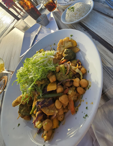 Read moreThe service is phenomenal! Really great attentive wait staff. The food was not that great. I ordered the Chickpea Salad (on the menu it stated lettuce, chick peas, peppers, onions, parsley, balsamic dressing thats it) I added chicken for a topper. Whatever I got was HORRIBLE. It was HOT not a cold salad which I was looking for since we were there for sunset and it was still 85 degrees. There was no lettuce, there was broccoli, cauliflower, zucchini, summer squash (???what, hot soft vegetables not even listed)...I tried to eat it best I could, couldn't even choke it down, and instead asked for a box and left it on the table. It was terrible. Seriously terrible. I should have spoke up but lost all faith in the menu after whatever the hell that was so just took the L. But for the cost, angering. My son ordered a steak and said it was good but not impressive by any means. There were people partying in the water on either side, loud music on either side and people in boats jumping off into the water with loud music themselves, kids running up and down in front of the beach playing/swimming, a random homeless looking man started playing guitar in front of the sunset that was not employed at the restaurant, a stray dog (and at this point he was the highlight because who doesnt love dogs) that the staff dragged off the beach :( and airplanes landing right next to you. For a sunset view not worth it. Super weird situation all around. It was like watching rich people just ignore their surroundings to get a good view. But again the waitstaff is phenomenal which it's why I'm giving it 2 stars otherwise it would get zero. Go somewhere else imo.