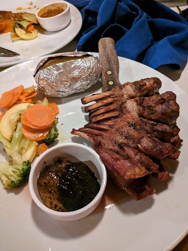 Let's start with the good. The service started off very good, with friendly staff greeting you, opening doors for you, etc. The atmosphere was great, with actual driftwood everywhere, making the place uniquely looking. My family went there because of the overall good reviews on Google and 2 dollar signs with cheaper dishes. Oh well we were very disappointed. All of the dishes we got, including the garlic bread and the (free) sweet pancake thing we got with our meal were very much from frozen / TV dinner type. The presentations looked way better than how the dishes tasted. My wife got one of the grilled fish dishes with Aruban sauce. The sauce was there to cover the frozen mushy tasting dish underneath. I got the rack of lamb that was supposed to be medium. It came out very rough and very well done, almost gave me the impression it was frozen then microwaved then maybe was put on grill for like 10 seconds to get the char flavor. I don't even remember what my son ordered. He barely touched his food. My younger son got chicken tender from the kids menu. It's very meh. Now back to the service angle. They had a floor manager like person roaming all the tables. He eventually had to take our order because our waitress simply went away after hearing that we only wanted water. She came back exactly once during our 50+ mins of stay, didn't really say anything. The young bus boy who delivered our cooked food even came by twice and was much friendlier than our waitress. At least the floor manager was decent and interactable. We waited 10+ mins for our free dessert that's part of the kids menu and another 10+ mins for a to-go box and our check. 3 nearby tables for much better and faster service than our table. I gotta think it's gotta be the fact that they all ordered wine. I would not recommend anyone to come here. There are much better restaurants nearby. Unless you want to pay $120+ for 2 dishes and 2 kids...