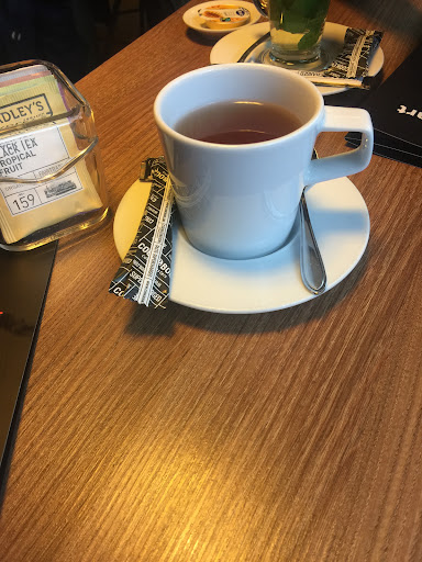 In één woord: vreselijk. Er staat een sinaasappelpers én een koffiezetapparaat continu te "draaien" én vreselijke muziek aan waardoor je elkaar nauwelijks kunt verstaan. Er zijn lichtbakken die van kleur veranderen. Het is er letterlijk koud. We wilden er gezellig lunchen. Maar hebben alleen koffie en thee genomen. Service was ook slecht. Dame vroeg wat ik wilde drinken. Ik zei: "Graag iets van bosvruchten." Zei zegt: "Rooibos." Ik zeg: "Nee. Bosvruchten." "Rooibos", zegt zij weer. Ik zeg: "Nee, bosvruchten." Zij weer: " Hebben we niet. Alleen rooibos." Pfff...
