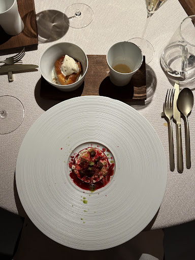 My one critique for a restaurant that’s going for 3 stars - towards the end of the night some cracks were showing; Knives/forks placed in a rush somewhat sloppily/ not straight. Critically once a cheese garnish was served in a rush and actually spilled over me. we could see the team arguing with one another water glasses slow to be refilled
