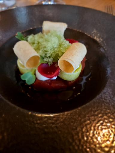 De amuse kwam met een rookgordijn. Een oesterschelp waarin een parel van rode biet in gelei van dashi, waarbij gemarineerde komkommer en rettich in een vinaigrette van rode biet met sjalot. We miste de oester en proefde frisse bietjes met goede texturen.
