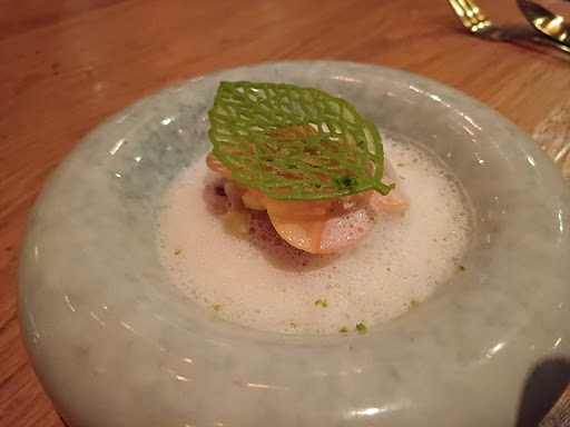 Voor de 10e keer retour naar Reusel, ditmaal voor een champagne lunch. Een selectie gemaakt door het Bochica team tijdens verschillende uitjes naar deze regio. Het restaurant is begin dit jaar van eigenaar gewisseld, de oude souschef is nu de patron. Parkeren kan nog steeds voor de deur, fijn. We werden begeleid naar een grote ronde tafel aan het raam, prima. Als aperitief Champagne Brut Reserve Premier Cru van Godmé Sabine die uitstekend beviel. Op een platte steen krokante tortilla's waarop cremeux van kimchi met dotje crème van hoisin afgewerkt met komkommerbloem, subtiele smaakjes die naadloos aansloten bij de champagne.
