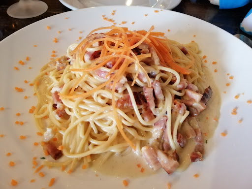 Pfoe waar zal ik beginnen...? Afgelopen zaterdag hadden we een familie meidendag. Met ongeveer 15 meiden hadden we een tafel gereserveerd. Bij aankomst zaten er al 7 van ons en hadden wat te drinken gekregen. De andere 8 bestelde de meeste wijn, maar 3 niet. Zij bestelde wat fris. De wijn kwam, maar het fris niet. 2 keer over vroegen we netjes of het er aan kwam. Dit werd ons steeds beloofd. Na zeker een drie kwartier sinds dat we er zaten(het was zeker 28 graden) zei mijn tante: meneer meneer meneer. Waarop de jonge knul zei: mevrouw mevrouw mevrouw. Mijn tante vroeg nogmaals naar haar drankje waarop hij zei dat het druk binnen was, dus dat we even geduld moesten hebben. Stomverbaasd waren we. Achteraf bleek binnen 4 tafeltjes van 4 man bezet te zijn... Voordat we de kaart kregen waren we ook haast een uur verder. Iedereen nam pizza of pasta, ik kan dit helaas niet eten vanwege allergieën dus koos daar voor de zalm met groenten en aardappels. Voor 24 euro mag je aardig wat verwachten neem ik aan. Na lang wachten(begrijpelijk met een grote groep mensen) kwam het eten. De zalm zag er op het oog goed uit, er zaten alleen drie krieltjes bij en drie stukjes groenten... waarna ik een hap nam van mijn zalm. Ik heb serieus nog nooit zoiets vies gegeten. Ik proefde gelijk dat het aangebrand was. Ik draai mijn zalm om en hij was pik en pik zwart. Zeker wel een halve centimeter dik. Stomverbaasd, dat je zoiets kan serveren... dat moet je geroken hebben in de keuken. Dat kan niet anders. De ober nam het mee naar de keuken en kwam al snel weer terug. Hij vertelde: de zalm komt uit een steenkooloven en ze waren vergeten het velletje eraf te halen. Dit hadden ze nog even gedaan van hetzelfde stukje zalm. Vervolgens neem ik nog een hap: kurk en kurk droog. De ober nam het weer mee en vroeg of ik een nieuwe wilde... nou graag voor die 24 euro... zat ik dan zonder eten, terwijl iedereen al lekker zat te smullen. Ook na het eten hebben we zeker nog 1,5 uur met onze legen borden voor onze neus gezeten. Ook gingen meerdere keren de drankjes niet goed. Jammer allemaal. Ik had veel goede verhalen gehoord, maar ik ga hier nooit meer heen. Hoe kun je twee keer over zo een domme fout maken...