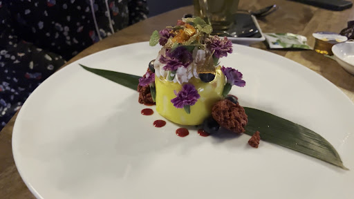 De vegetarische opties die wij kozen (en die op ons verzoek zelfs vegan zijn gemaakt), waren rijkelijk versierd met kleurrijke eetbare bloemen en verse avocado, wat zorgde voor een visueel aantrekkelijke presentatie. Deze gerechten waren royaal geproportioneerd, met de groene curry als keuze die ook de meer gezondheidsbewuste gasten aansprak.
