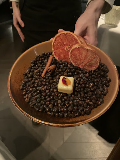 We mochten een tafel kiezen en dat werd er een aan het raam. Als aperitief een blanc de Noir champagne uit Mailly gemaakt van Pinot noir die uitstekend beviel. Uit de keuken een praline van witte chocolade met een vloeibare vulling van perzik, erg lekker. Erna een hapjes trio. Twee merengues van tomaat, basilicum en zwarte peper waartussen burrata gekruid met een vleugje tamarinde, mooie zachte textuur en verfijnde smaken. Op de witte steentjes een brique rolletje gevuld met een tapenade van zwarte olijf afgewerkt met een dotje zure room en plakje taggiasche olijf, mooi hoog op smaak. Op de geschaafde amandel een harde wener met tartaar van gebrande paprika waarop een chip van Amsterdamse ui gevuld met harissa mayonaise, de krachtige paprika in de hoofdrol.