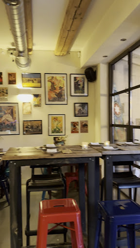 Wij werden begeleid naar achter. Hier stonden wat gammele kleine, hoge en lage tafels. We mochten kiezen waar we gingen zitten en kozen de hogere tafels met hoge stoelen. Veel stoelen / krukken waren niet voorzien van een rugleuning, maar wij konden nog wisselen aangezien we de eerste waren en pakte stoelen met rugleuning.