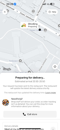 Read moreI can’t comment on the food as I cancelled the order, ordered at 7.04pm, was advised it was on route at 7.50pm, order cancelled with Uber at 8.30pm as they did not answer my repeated calls to ask for an update. Receive a call at 9.04pm from the driver saying he had my order at my apartment. I advised him that the order was cancelled. This screen shot is the update they did at 8.28pm, when it was originally scheduled for delivery between...