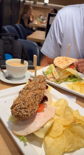 Read moreDit lijkt een aardige plek, maar is helaas zonder positieve uitstraling gebleken. De serveerster leek ongeïnteresseerd en bleek ons ook niet goed te horen of te verstaan. Was ook niet op de hoogte of ze wel of geen glutenvrije broodjes hadden. Dat hadden we reeds aan de toonbank gevraagd aan een iets oudere dame die ons dat, overigens wel vriendelijk, bevestigde. We bestelden drinken en een gewone club sandwich en eentje op een glutenvrij broodje. Had ik nou ook maar een glutenvrij broodje besteld🫣. Die zag er in ieder geval nog beter uit en was een broodje inderdaad. De gewone bestond uit 1,5 pitabroodje😱, zie foto's. Gebakken kipfilet.....dacht het niet. Kouwe kipfilet broodbeleg🤔. Lekker warm uitgebakken spek....dacht het niet. Kouwe gekrulde spek, wel 2 stuks, die smaakten naar.....niks eigenlijk😝. Niks geen komkommer, niks geen ei..... Drama. En dat voor "slechts" Eur. 12,95 per broodje uhh pita?! Toen we wilden afrekenen gunde weer een andere dame ons nog geen blik waardig😱. Gelukkig kwam toen de enige vriendelijke mevrouw die ons liet betalen. Dat is danook de enige reden om hier 2 sterren voor service te geven. Wat een...