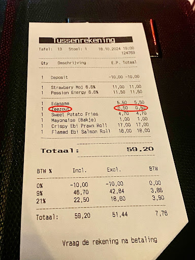 EN DAN NOG DIT: We bestelden edamame (sojabonen), wat overal standaard met zout wordt geserveerd. Hier rekenen ze doodleuk €0,50 EXTRA VOOR ZEEZOUT! Serieus?! Het gaat niet om die €0,50, maar het feit dat je het lef hebt om zoiets belachelijks nog in rekening te brengen. Dit heb ik werkelijk NERGENS anders meegemaakt.