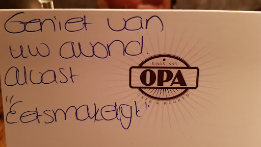 Read moreIn de afgelopen jaren meermaals gegeten (diner) bij Cafe Opa. Ik moet zeggen dat ik de kwaliteit achteruit minder vind geworden.De bediening is niets op aan te merken, leuke jonge vlotte mensen. De drankjes staan snel op tafel. Wij waren op een donderdag (vroeg) in de avond. Duurde toch vrij lang voordat het voorgerecht kwam. Ook de tijd tussen voor en hoofdgerecht duurde heel lang. We hebben zelfs moet vragen waar het bleef.... Een van de tafelgenoten had een biefstuk. Gaarheid was okay, maar dat zwartgeblakerde aan de buitenkant was minder okay. Ikzelf had de varkenshaas (bleken stukjes te zijn) in champignonsaus. De saus was echt niet vers (meer). Smaakte naar van alles, behalve champignons. Ook de harde zwarte stukjes champignon waren geen toevoeging... Ook tijdens de corona-golf daar eerder gegeten met een aangepast corona menu. Ook toen vond ik de kwaliteit van het voedsel minder. Maar ik dacht dat dat een uitzondering was. Bleek niet zo te zijn. Voorlopig voor mij geen...