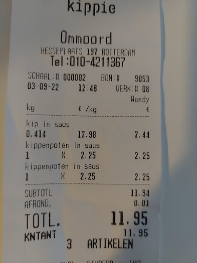 Leuk verzonnen de naam Kippie. Het houdt in feite alles in wat in deze zaak te krijgen is. Kippie dus. Er zijn al meerdere zaken van Kippie.o.a in winkelcentrum Keizerswaard op Zuid. Ook een winkel en etalage vol met kip. Je kan er allerhande kipgerechten krijgen, maaltijden kip, dus voor 10 man 10 maaltijden kip, zgn kant en klare kippenpannen, in de oven zetten en klaar, ook kan je allerhande kipsnacks krijgen en broodjes met kip enz. Als je naar Kippie toegaat kijk je toch wel je ogen uit, alles is uitgestald in koelvitrines, je kan bestellen wat je hebben wilt. De prijzen zijn heel reëel, maar kip is ook niet duur. Het personeel is vriendelijk. Het is wel zaak aan dat personeel te vragen hoe je het klaar kan maken, vooral alle losse waren. Ik vind dat toch een manko, gebeurt mij ook vaak, niet alleen bij kippie, maar ook bij de visboer, met visschalen e.d. Waarom koop men niet een labelapparaat, bijv Dymo labelwriter. Dan kan je erop schrijven (tikken) hoe je het moet klaarmaken, bakken e.d. en hup de label erop. Niet zo duur en zeker niet moeilijk. Kippie is een familiebedrijf, opgericht in 1945. Wat begon als een kleinschalige organisatie met verschillende poelierswinkels, toen nog onder de naam Krijgsman Poeliers, is uitgegroeid tot een grote succesvolle...