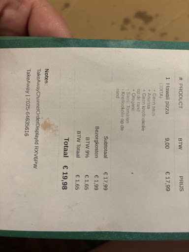 Mijn bestelling geplaatst rond 18:30/18:45 en de bestelling zou komen rond 19:30. Tegen 20:15 was er nog niks en ging ik bellen. Kreeg te horen dat ze aan de receptie waren gegeven omdat de bezorger mij niet te pakken kreeg (erg vreemd gezien ik niks heb gehad) dus liep naar beneden. Eenmaal aangekomen lag mn pizza om de hoek van de receptie, zonder briefje/bon oid. De receptie wist van niks en hadden niet eens weet dat er wat stond.