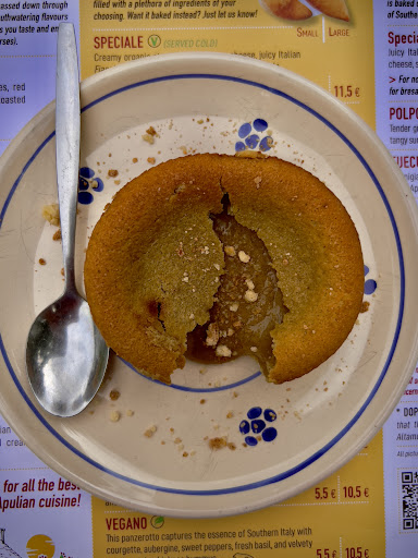 Read moreOverall good but not wow. The place itself is not very fancy, is quite small and resembles a cafeteria, but the service was fast and the waitress was very friendly. As a a drink we tried the Prosecco which was very good but unfortunately not bubbly at all, like the bottle have been opened for a long time. We have ordered a second glass and then I could hear the “pop” of a new bottle being opened, so the second glass was exactly what it should be. We then started with an antipasti pugliese which was okay, not bad but also not wow in terms of taste. However, it was too small for its price and for two people. I would say the quantity of food could be for one person, not two. Then we have ordered the panzerotti, the salame one with nduja sausage and 4 maggio with Gorgonzola and pumpkin with the extra truffle oil. I have to say the panzerotti were absolutely delicious: warm, crispy on the outside, gooey and soft melted cheese on the inside, and the flavors were really good. Especially the 4 maggio one was amazing, I would definitely recommend it. We then ended our dinner with a pasticciotto leccese which was quite disappointing. I was expecting a velvety smooth lemon custard inside, as described in the menu, but what I got was a sweet pastry dough with some sort of custard inside which you could barely see that was quite hard and tasted nothing like lemon. So in the end the dessert was basically a sweet dough. Would I recommend this place? Yes, but only for the panzerotti. Would I go back to dine it again? Probably I would just order...