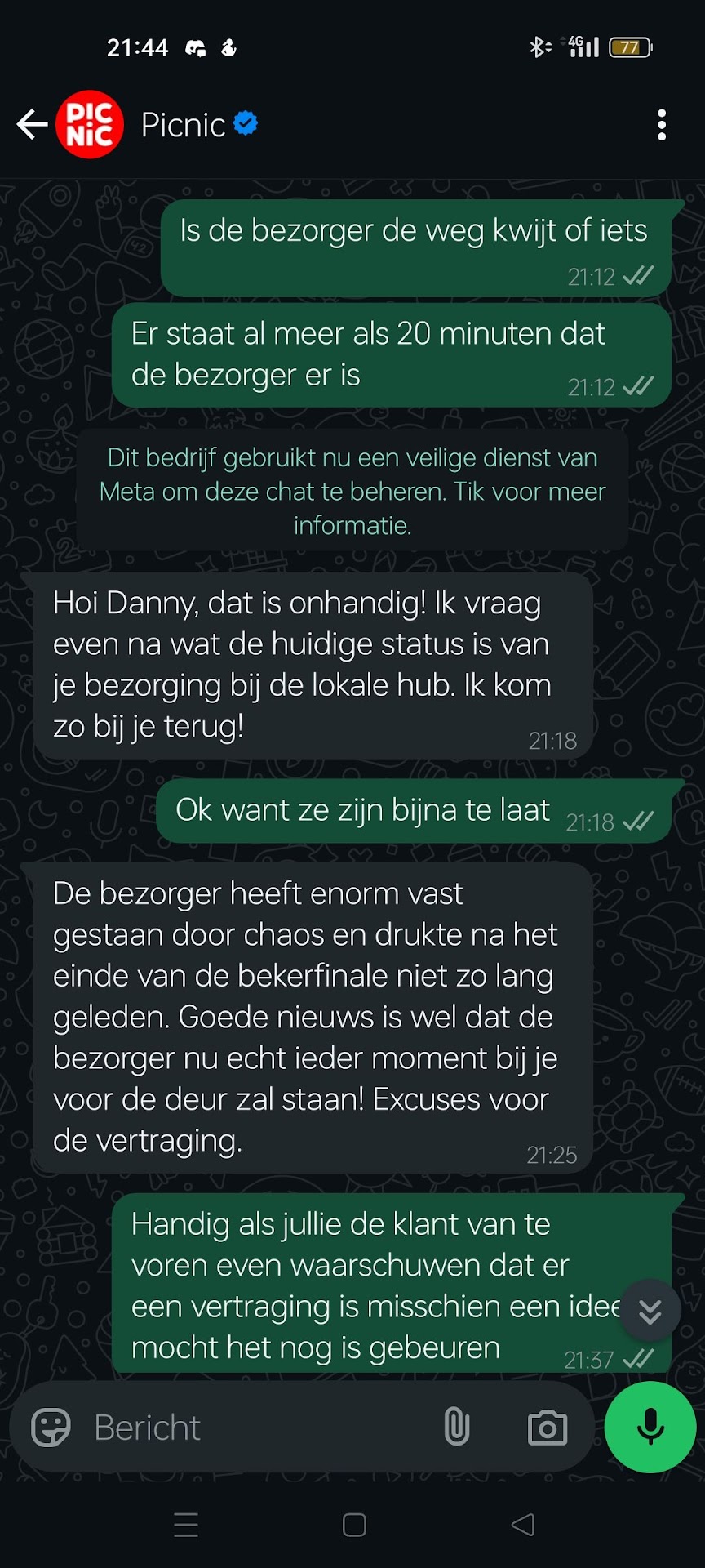 Read morePICNIC is een bestel service met boodschappen aanhuis (zoals AH, Jumbo, COOP, enz). Ze zouden gisteren 11 december de boodschappen leveren tussen 21.00 - 22.00 uur, echter na 22.15 nog niemand gezien. Telefonische contact opgenomen met het bedrijft, en verteld dat de APP aangeeft dat hij voor de deur staat, maar er staat niemand. Ook verteld dat ik om 22.30 uur niet meer opendoet en dat in bed ligt, omdat ik om 06.00 uur op moet. Ze vertelde dat hij voor mij nog 2 klanten had en dat ze contact met hem ging opnemen om door te geven dat hij na 22.30 uur niet meer kon leveren. Om 22.34 uur ging de deur bel, ik heb niet opgedaan, echter 3 minuten later belde de persoon nogmaals. Ik de volgende dag weer gebeld met de klantenservice, en gezegd dat ik de boodschappen niet meer wilde en dat ik mijn geld teruggestort wilde hebben, dat kon behalve van de 2 kannen melk en de Yakult kreeg ik het geld niet terug zei ze. Omdat dat bederfelijke producten waren. Dus ik heb gezegd zijn het oude zuivelproducten met niet langere houdbaarheidsdatum i.p.v. van 1 a’ 2 dagen, omdat ze deze niet wilde vergoeden. Ze zei dat kan ik niet zien want ik zit op de klantenservice. Maar ik kreeg van deze producten mijn geld niet terug en van de rest wel. Dus ik heb afgesproken dat ze vandaag nog konden leveren en dat ik hier nooit meer wat besteld, zeker niet wanneer je vooruit moet betalen, en hun over je geld beslissen. M.a.w. PICNIC komt de afspraken NIET NA, en ik moet er voor boeten. -------Gewoon voortaan bij AH bestellen-------
