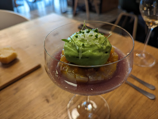 We enjoyed the 5 course dinner (missed the photo of the meat dish), which presented a varied menu of seafood, vegetarian, and meat dishes. We ordered a beautiful sparkling rose bottle to accompany the dinner and asked for a red wine recommendation for the meat dish. Our very nice, attentive, and friendly server recommended a glorious red wine that paired perfectly with the dish (even though it was not normally offered by the glass, many thanks for that!). The highlight of the evening was by far the vegetarian dish, which was a rare combination of green apple, avocado, and salsa macha. Pure perfection and bomb of flavors!