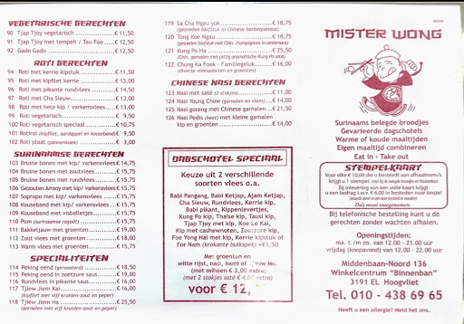 Read moreik haal al meer dan 15 jaar eten bij Mr. Wong. De gerechten zijn erg lekker, de porties zijn groot (mijn partner en ik kunnen 1 gerecht delen als avondmaaltijd, en is er soms ook nog wat over!), en alles tegen een heel schappelijke prijs. Wij bestellen vaker onze Kerstmaaltijd bij Mr. Wong, zo lekker is het. Het is zeker een afhaalrestaurant -- ze hebben wat tafels, maar het is niet waar je gaat voor een avondtje uit. Wel prima voor een lunch tijdens het winkelen of zo; dit heb ik vaker gedaan. En je moet inderdaad voldoende contant bij je hebben -- al kan je ook even naar de geldautomaat lopen (3 min) terwijl je eten wordt voorbereid -- want pinnen is niet mogelijk. In tegenstelling tot wat andere reviewers schrijven, heb ik nooit problemen ervaren met mijn speciale verzoeken, zelfs bij grote aantallen broodjes waarbij de wensen qua sambal en komkommer enorm verschilde. Ook werd netjes op de zak geschreven welk broodje welk speciale eisen had. Ook nooit heel lang op mijn eten moeten wachten. Hun Surinaamse gerechten zijn over het algemeen prima. Veel van mijn familie is Surinaams, en ze halen daar graag een Tjauw Min Moksi of een Gezouten Amsoy schotel. Alleen de Pom vind ik niet zo lekker. En hun Chinese gerechten zijn voortreffelijk. De Kip met 5-kruiden is het favoriet van mijn peetzoon, en de Koe Loe Kai is uitstekend. Alles bij elkaar, echt...