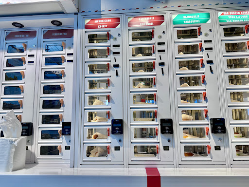 Pay with your card, press the button beside the item you want, the door opens, you get the snack with a piece of tissue that’s already included in the “lockbox” and then you shut the door. A 15 second process!